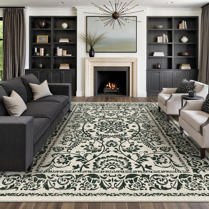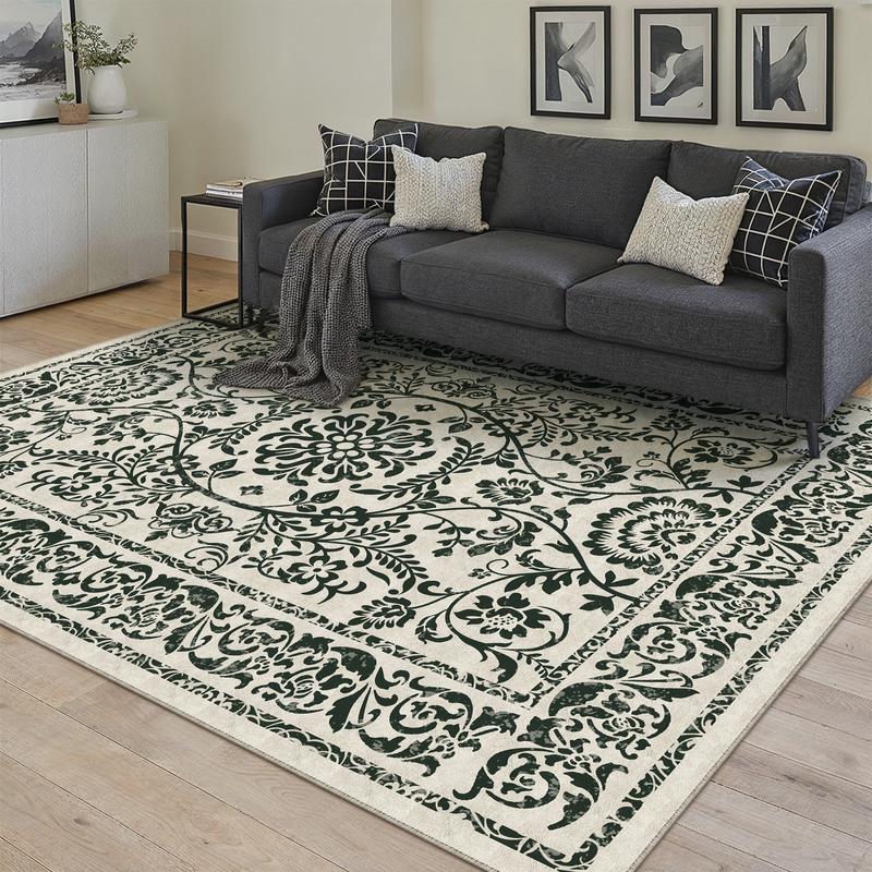 【Black Friday & Cyber Monday】Purecozy Washable Floral Area Rug Beige /Black and Whiteliving Room Carpet Scalloped Flower Non Slip Soft Bedroom Rug Farmhouse Low Pile Thin Indoor Floor Cover for Office Dining Room Kitchen Bathroom