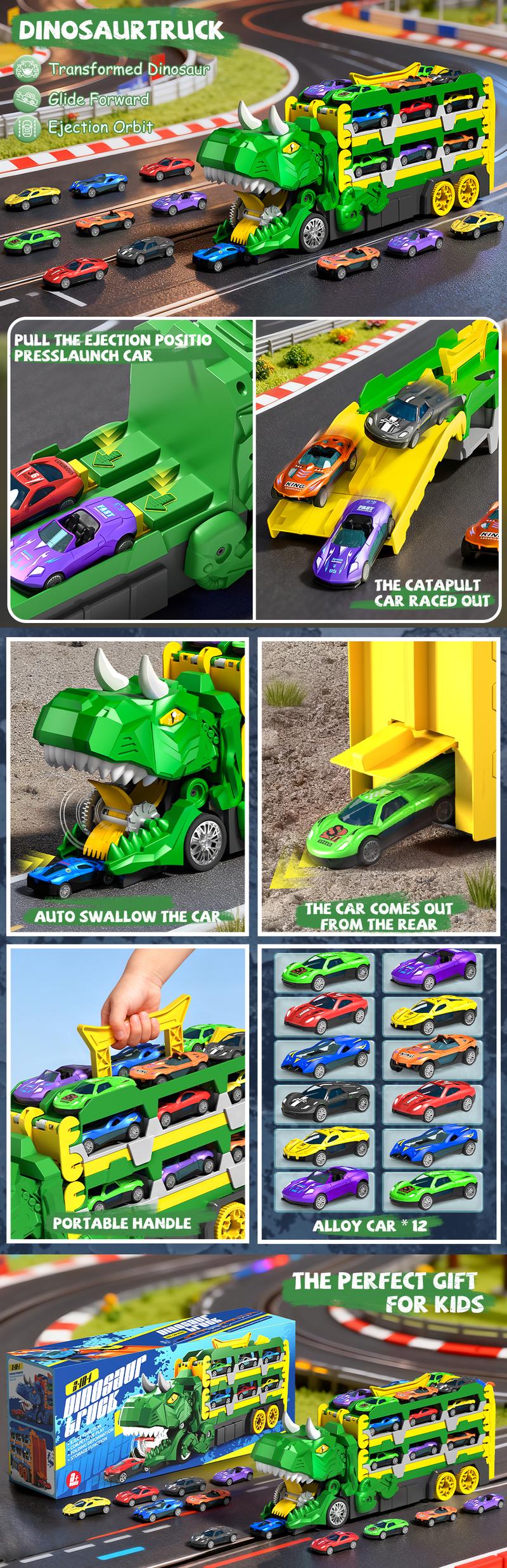 Dinosaur Transport Truck Toy for Toddlers – 12 Die-Cast Cars, Transforms into Dino, Perfect Gift for 3-6 Year Old Boys