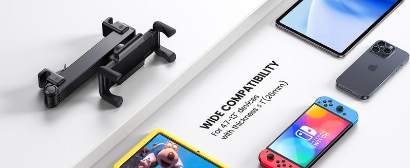 - Compatible with 4.7 - 13" tablets and phones, supporting up to 1" (26mm) thickness. It fits 2024 iPad Pro 13 inch, Pro 11, iPad Air 6/5, iPad Mini, Galaxy Tab, Kindle, Fire HD, iPhone 17 Pro Max, and more. The headrest rod distance range is 3.7" (94 mm) - 6.3" (160 mm), with a max headrest hook diameter of 0.51" (13 mm).