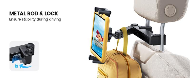 - Made of high-quality metal, the headrest mount includes a metal buckle for a secure lock. The rubber pads on the tablet clip prevent scratches. This ensures stability during driving.